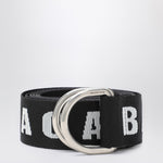 Balenciaga belt in black mixed nylon with contrasting unity sports icon pattern, jacquard logo lettering, metal tip with engraved logo, antiqued silver finishes, and adjustable closure. Size and Fit - Height 4 cm