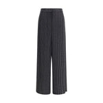 Giorgio Armani’s wide-leg silk Pants stand out for their elegant flowing lines and refined details. Featuring a smooth waistband, concealed fastening, and side pockets, they are embellished with rich, tone-on-tone embroidery made with baguettes and sequins, creating a luminous pinstripe pattern, lending the garment a touch of glamour and sophistication.
