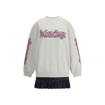Balenciaga’s Sweatshirt Dress combines comfort and urban style with a distinctive touch. Featuring a contrasting printed logo on the front, it features a ribbed collar and cuffs and dropped shoulders for a relaxed fit. A worn-in denim pleated skirt completes the design, creating a unique blend of casual and grunge for a contemporary and original look.