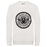 Balmain white cotton crewneck sweatshirt with contrasting black velvet logo print, ribbed collar, cuffs and hem