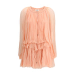 The mini Dress with cape in silk muslin by Chloé is crafted from the house’s iconic organic silk and features a gathered silhouette enriched with ruffles and drawstrings finished with Gold-tone metal tips. The design includes a back zipper, adjustable drawstrings at the waist and neckline with hammered details, and a separate lining that enhances the garment’s airy structure. The organic silk used for this piece minimizes chemical usage, preserves biodiversity, improves soil quality, and reduces water consumption. The dress is produced in partnership with Akanjo, a WFTO-certified supplier in Madagascar and a long-standing Chloé partner dedicated to fair wages, worker well-being, and the preservation of artisanal craftsmanship.