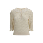 Chloé Sweater is a refined piece that combines delicacy and craftsmanship. It features a distinctive embroidered collar that adds a touch of elegance, and a mid-bust front button closure that defines the style. The openwork knit design lends a light and sophisticated texture. The 3/4 sleeves are embellished with scalloped ruffle cuffs, adding a romantic and feminine detail, while the ribbed hem completes the garment with a curated finish.