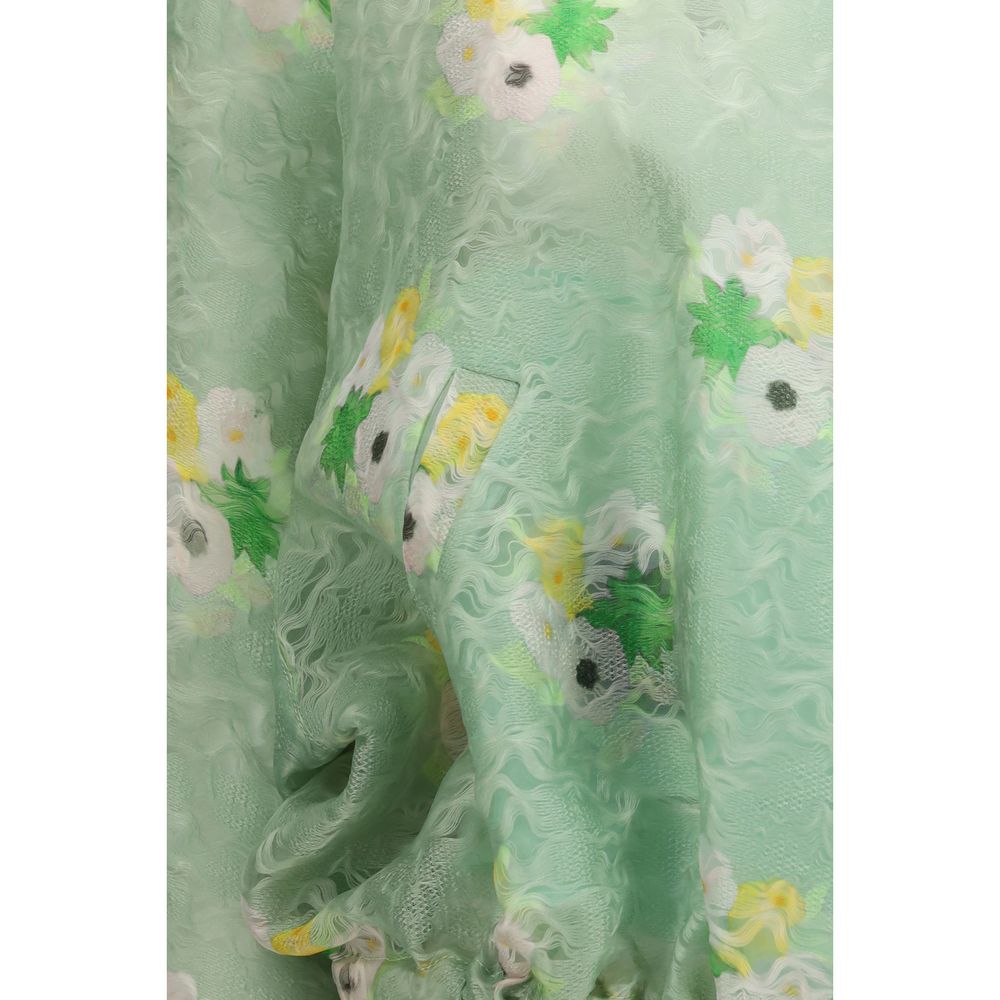 The Organza lace Jacket by Fendi is bomber-inspired, with a shirt collar and raglan sleeves. It features diagonal pockets, a zip closure, an elasticated hem, and elasticated cuff straps adjustable with buttonholes, allowing the fit to be adjusted and the volume defined. Made of organza lace with the all-over Fendi Bouquet motif printed in white, yellow, and green tones, it is completed with 8 mother-of-pearl buttons.