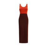 Fendi’s long knit Dress features a fitted silhouette and sleeveless design with thin straps and a wide round neckline. Made of viscose yarn with a color-block pattern, it combines elegance and modernity in a sleek, feminine silhouette.