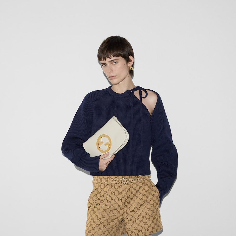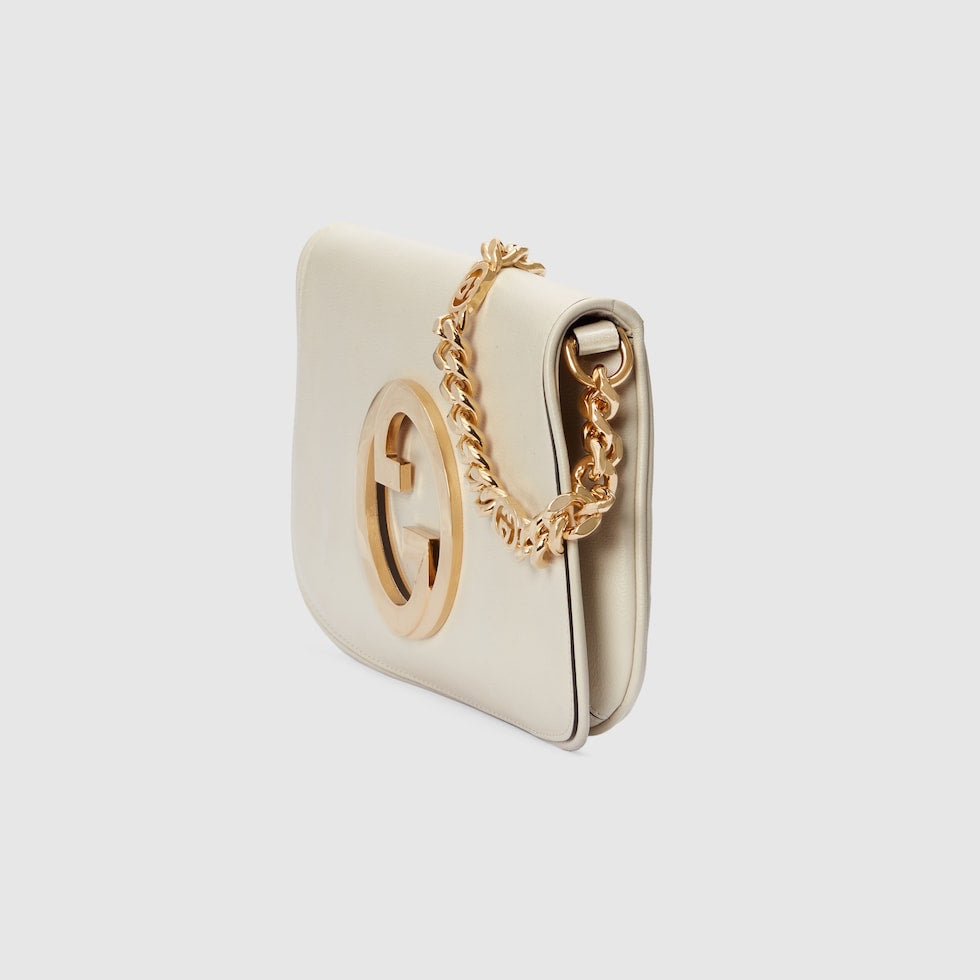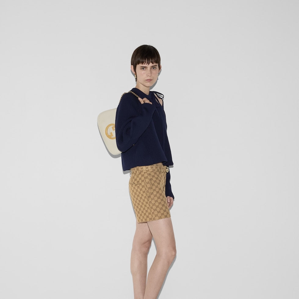 Coming from the House’s archives, a round shaped version of the Interlocking G logo is reintroduced for Gucci Love Parade. Crafted from white leather, this shoulder bag is completed by a delicate chain strap, infusing this accessory with a refined feel.