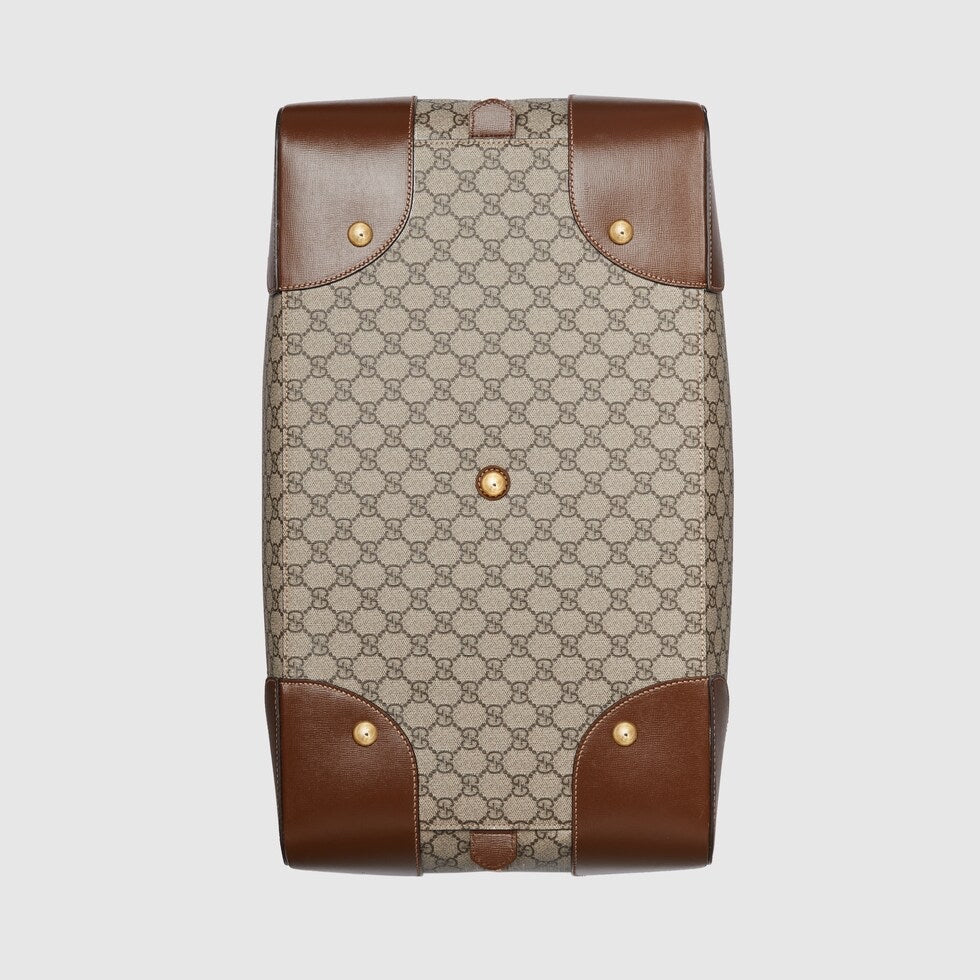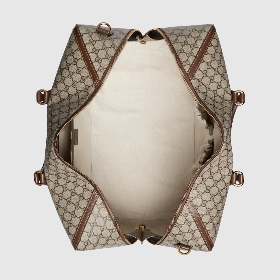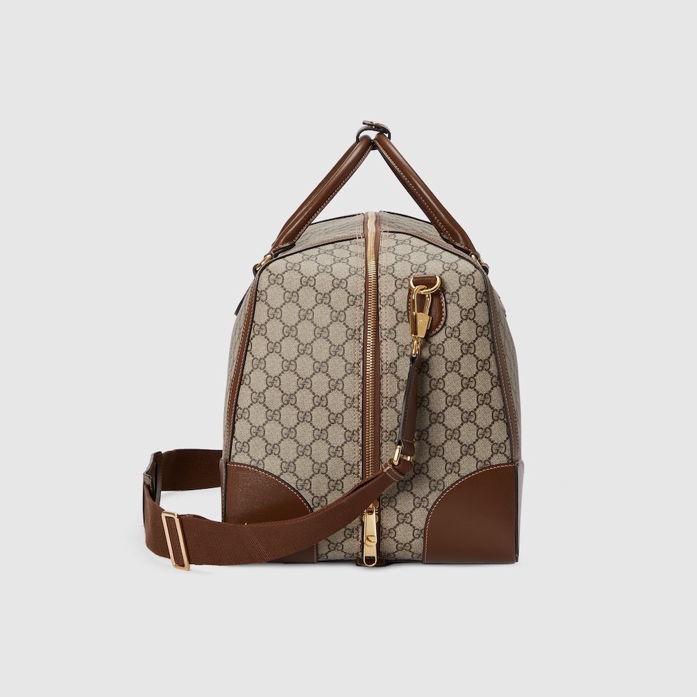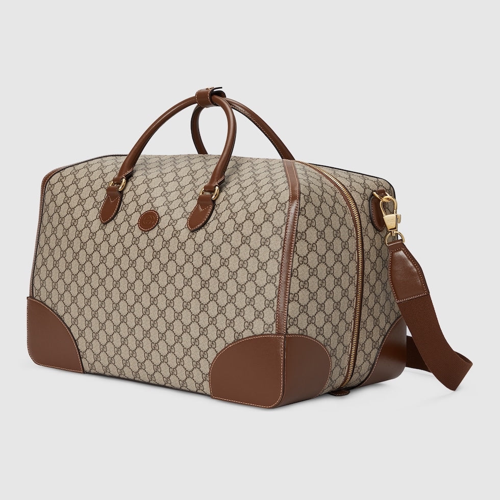 The Interlocking G has remained one of the most symbolic codes of the House since its introduction. The distinguishing emblem appears as a leather detail atop this large vintage-style duffle bag, a subtle reference to Founder Guccio Gucci. Completing the design’s logo feel, the signature GG Supreme canvas appears alongside an elegant brown leather trim.