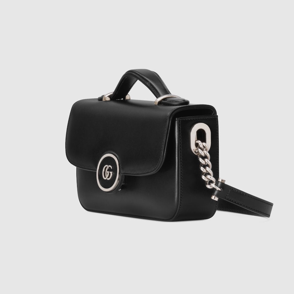 The Petite GG mini chain shoulder bag has a softly structured shape, completed by the Double G. The leather shoulder strap is adjustable, allowing it to be styled as a crossbody, whereas the classic black leather draws attention to the line’s monogram hardware.