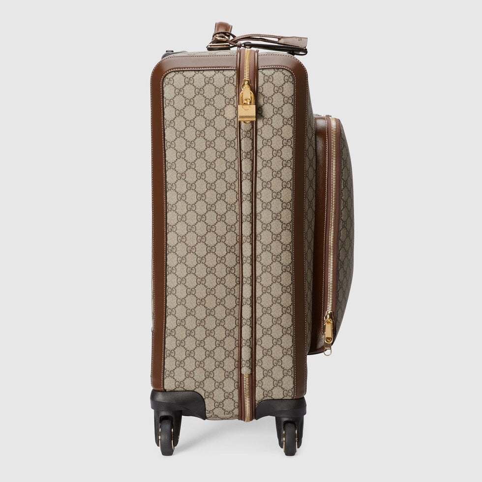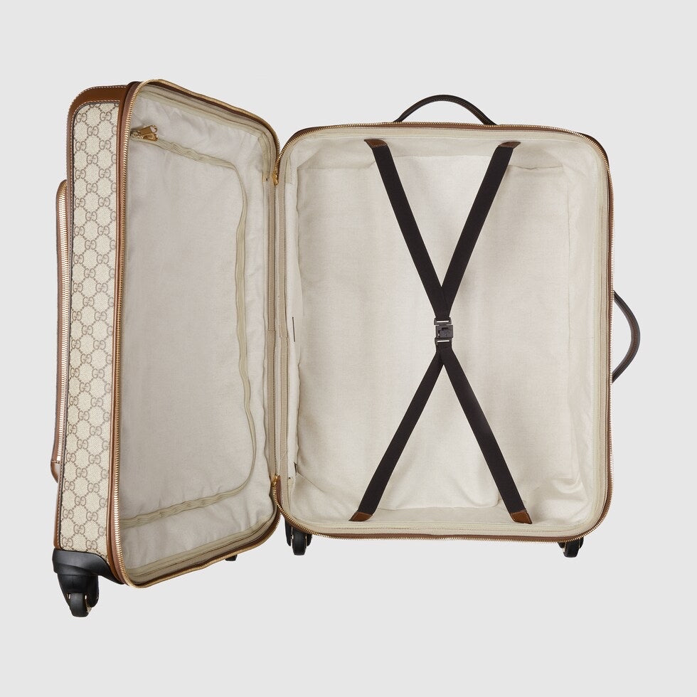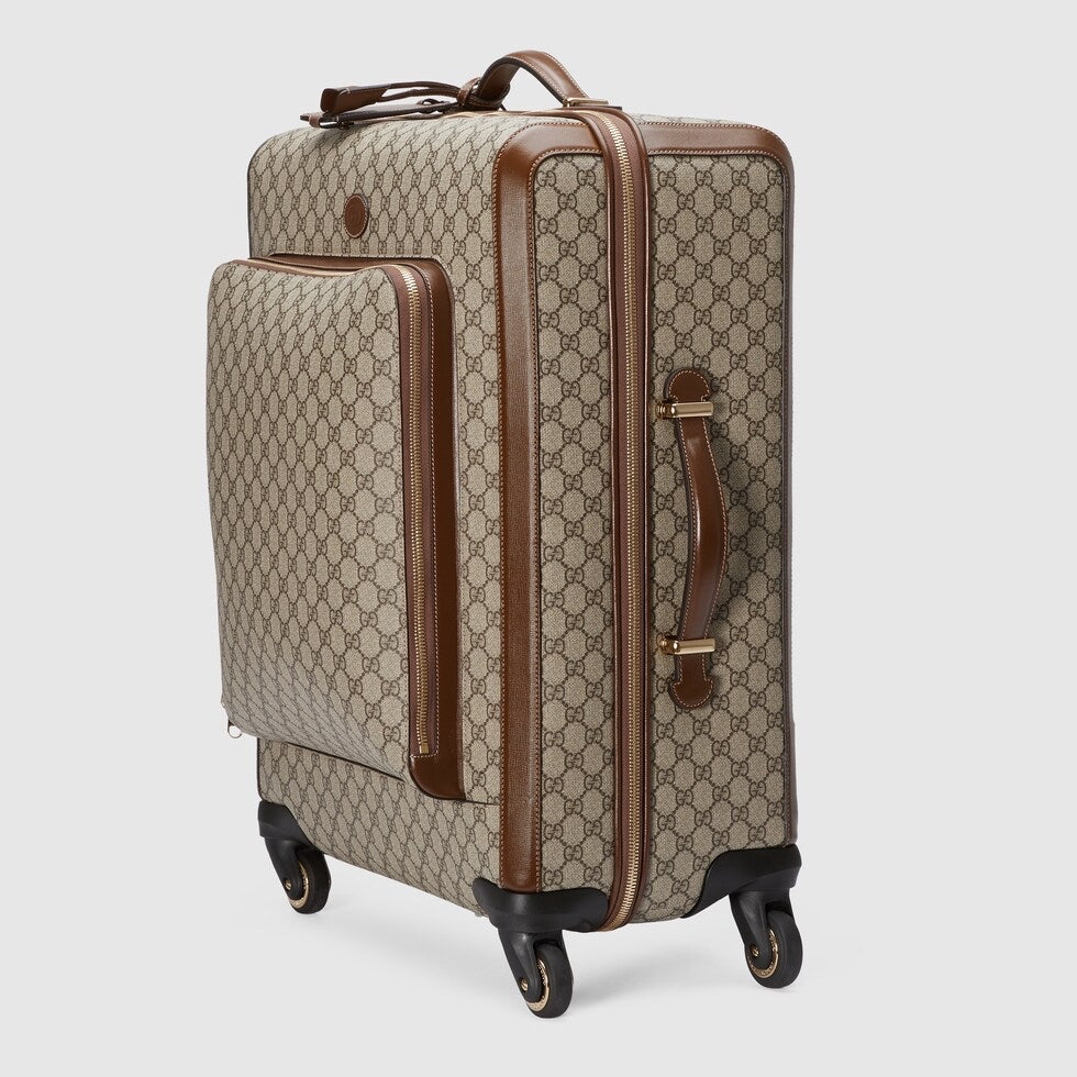 Inspired by vintage travel and referencing Guccio Gucci’s beginnings at the Savoy Hotel in London, Gucci latest range of luggage pieces in beige and ebony GG Supreme canvas transforms heritage pieces into contemporary everyday accessories. This medium wheel suitcase is complete with the Interlocking G tag.