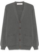 medium grey front button fastening two front patch pockets V-neck ribbed trim Cotton v-necked cardigan