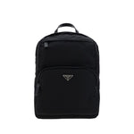 Re-Nylon backpack by Prada, handle on leather top, adjustable shoulder straps, padded mesh back, zippered top closure, interior slit pocket with zipper closure, interior patch pocket, two exterior zippered pockets, contrasting iconic monogram band patch on front.