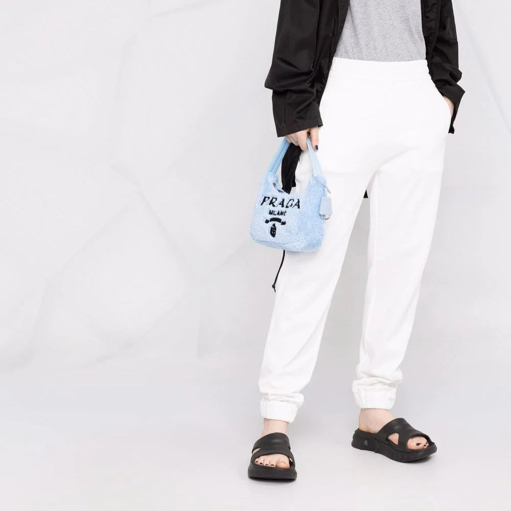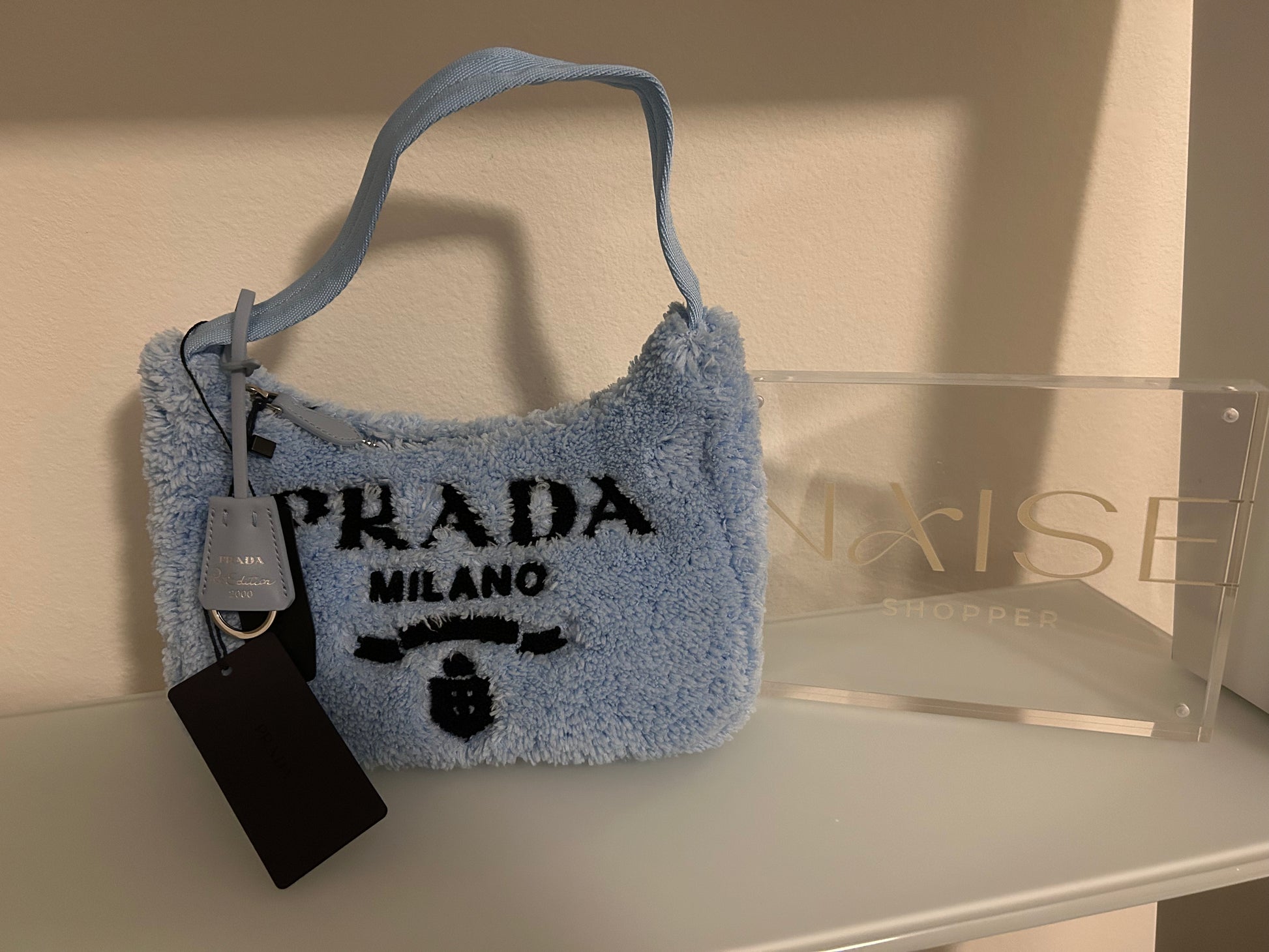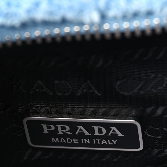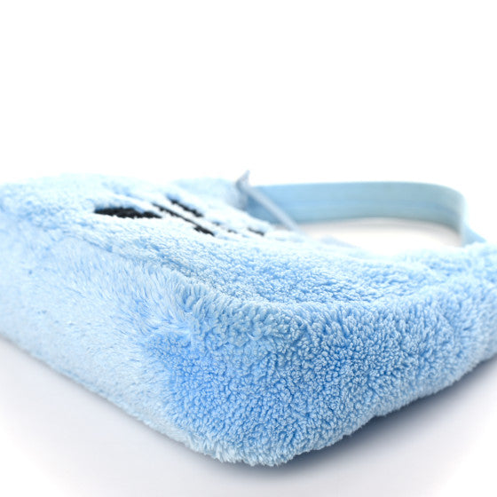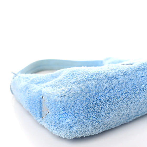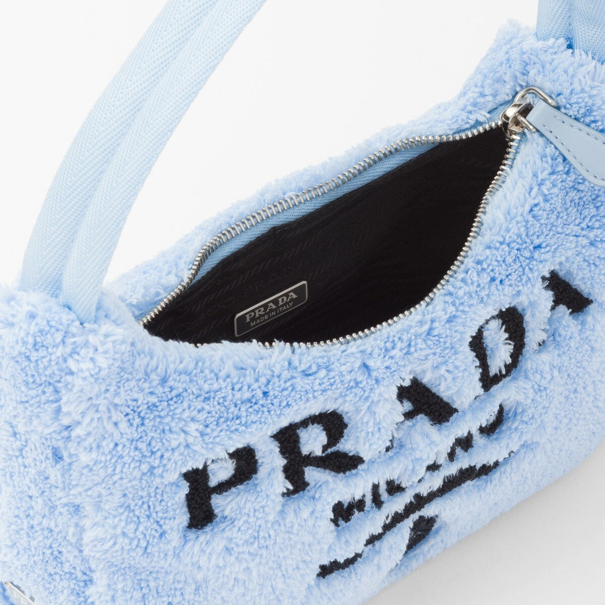 Vivid color contrasts and an ironic character define the Re-Edition 2000 mini hobo bag in soft terry with a summery mood. Prada's iconic lettering logo embroidered on the front embellishes the silhouette, a reinterpretation of a historic style of the brand.