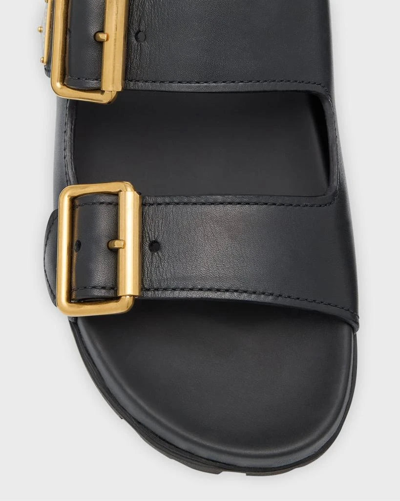 These leather slides with a casual style are defined by clean, contemporary lines. This versatile footwear characterized by straps with metal buckles are completed by rubber soles with a lug tread. The enameled metal triangle logo embellishes the style with its sleek and iconic signature touch.