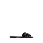 Calfskin Tribute Sandals by Saint Laurent, square toe, flat sole, woven on front, logoed insole.
