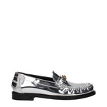 The product with MPN 10121231A043021E01V and code F83780 leather in silver is a loafers designed by Versace. It has features like front logo, metallic effect.