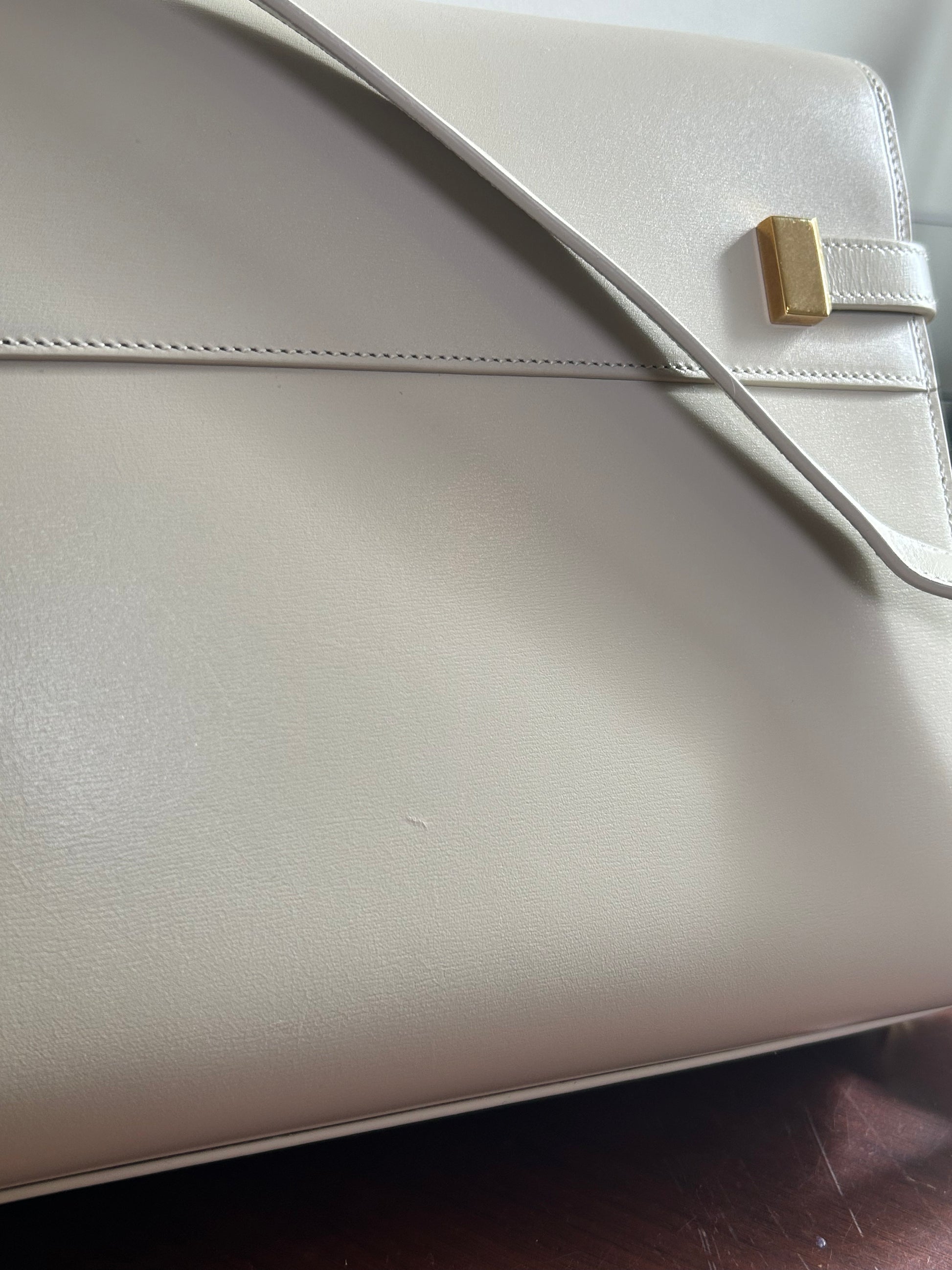 Designed with functionality in mind, the medium size provides ample space for daily essentials while maintaining a sharp, tailored profile. An adjustable leather strap allows for comfortable shoulder or crossbody wear, offering versatility without compromising the bag’s elegant form.