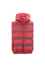 Discover opulence in outerwear with this stunning, brand new Versace vest. A harmonious blend of style and warmth, this piece boasts black bands adorned with the iconic white ‘Versace’ logo and a hood that promises versatility with its snap button closure, easily removable by zip. The vest’s elasticated bottom ensures a snug fit while making a statement in its vibrant red hue.