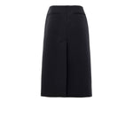 Side opening with gold hook and hidden zip, two side welt pockets, medium length. Gaucho skirt/pants model with symmetrical front/back slits.