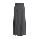 The pleated long Skirt in virgin wool techno gauze by Brunello Cucinelli stands out for its fine materials and refined details. The lightweight fabric enhances the wide pleating that runs along the entire length of the garment, creating a sense of fluidity and movement. The zip and tab closure, combined with the back welt pocket, evoke masculine tailoring codes, while the hem with slits emphasizes the feminine silhouette. Completing the design, the signature monile detail adds a luminous accent, a distinctive mark of Brunello Cucinelli’s timeless elegance.