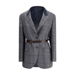 Brunello Cucinelli’s Prince of Wales pattern Blazer reinterprets a masculine classic with contemporary and sophisticated details. Featuring peaked lapels and a front button closure, it stands out for the refined denim detail applied to the collar, which adds an unexpected touch to the traditional design. Completing the design are two flap welt pockets on the front and an adjustable and removable leather belt that elegantly enhances the silhouette.