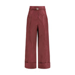 The taffeta silk Trousers by Fendi feature a high-waisted silhouette highlighted by a structured waistband panel and front pleats that create refined volume. Side pockets and a wide turned-up hem enhance the contemporary elegance of the design. Belt loops are paired with a matching belt featuring a palladium-finish FF metal buckle for a signature touch. A concealed zip ensures clean, streamlined lines. Crafted from bordeaux silk taffeta, these trousers blend tailoring, character, and sophisticated lightness.