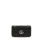 The GG Marmont medium Shoulder Bag by Gucci is a classic reinterpreted with contemporary elegance. Made of black matelassé lambskin leather in a chevron pattern, it is enhanced by light gold hardware details and Gucci Red Ancora viscose lining. The spring-loaded flap protects items, while the interior features a zippered pocket and the exterior an open pocket. The sliding chain strap allows it to be carried comfortably over the shoulder.