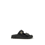 The nappa leather Slippers by Miu Miu are crafted from padded and quilted matelassé nappa leather, enhanced by metal lettering logo detailing on the side. The design features a round toe, velcro straps across the instep, and a printed logo on the inside. A contemporary and comfortable style that reflects the brand’s refined and distinctive aesthetic.