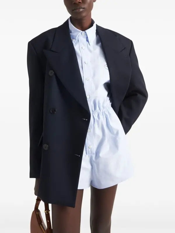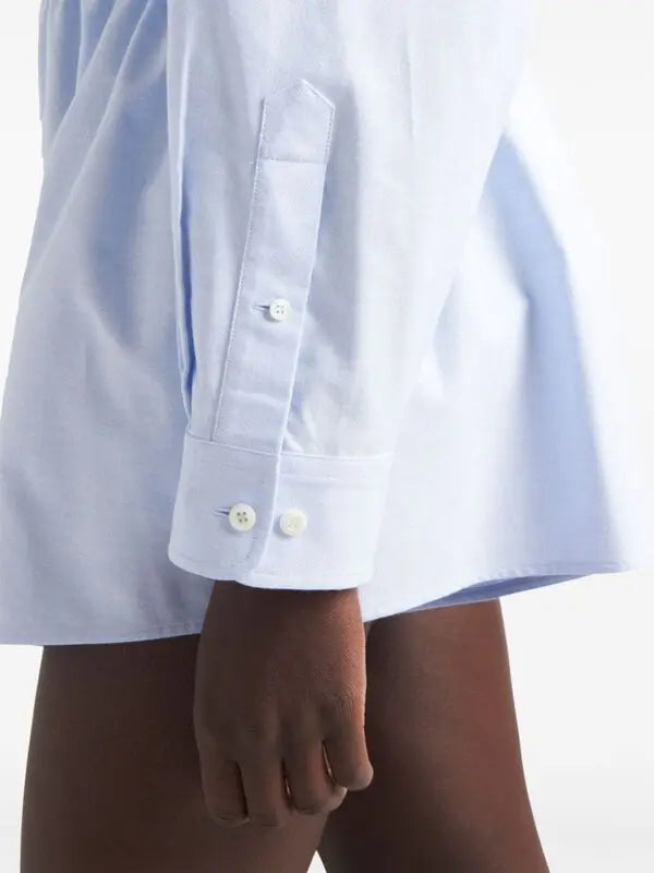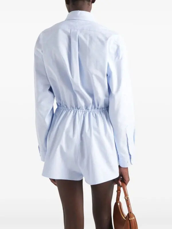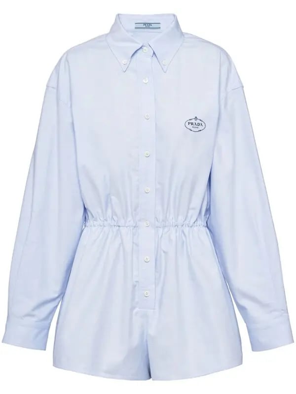 This Prada playsuit is crafted from light blue cotton and features a classic collar, button fastening, embroidered logo at the chest, long sleeves, buttoned-cuff sleeves, and a flared hem. The playsuit has a drawstring at the waist. It wears short if you are taller than 5'6"