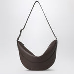 Brown leather shoulder bag by The Row, featuring a crescent design, zip closure, small side logo lettering, and an adjustable shoulder strap with a metal buckle. Size and Fit - Width 16 cm x Height 14 cm x Depth 10 cm Shoulder strap lenght 50 cm