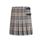 Burberry’s Check Archive Wool Miniskirt features a flared silhouette with pleats that give it movement and femininity. The waist is finished with short, thin bangs, while leather straps with a B-shaped buckle allow for tailored adjustment. The side closure is embellished with buttons and a buckle engraved with Burberry lettering, a refined detail that celebrates the brand’s distinctive elegance.