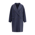 Brunello Cucinelli’s cashmere Coat expresses elegance and quality craftsmanship in every detail. Featuring a wide peaked lapel and a double-breasted closure with contrasting buttons, it has two welt flap pockets applied on the front. The monochrome design, over-fit and mid-length make it a sophisticated and versatile garment, perfect for completing refined looks in the cold season.