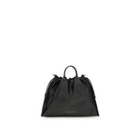 Leather Shoulder Bag by Brunello Cucinelli featuring two flat top handles, drawstring closure, adjustable and removable shoulder strap, single compartment, iconic brand monogram press-stamped on front, monochrome pattern.