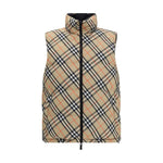 The Reversible Puffer Gilet by Burberry is a versatile piece that combines functionality with iconic style. Padded with goose down and feathers, it ensures warmth and lightness. The reversible design shifts from the signature Burberry Check in sand beige to a solid nylon, making it easy to adapt for different occasions. A two-way zip closure, side zip pockets, and a drawcord hem add practicality, while the silicone patch with the Equestrian Knight Design at the chest lends an archival finishing touch.