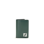 Leather Card Holder by Fendi is a compact and refined accessory, offered in a billfold model. The front features a three-dimensional plaque with the iconic FF logo, the distinctive symbol of the maison. The interior is organized with card slots, while the back panel is embellished with a jacquard fabric detail featuring the repeated FF logo for an instantly recognizable touch of style.