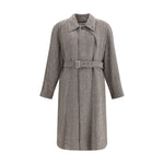 The Coat by Ferragamo is crafted from a refined herringbone-patterned fabric, showcasing timeless sophistication. It features a button-front closure and two front welt pockets. The structured collar includes an additional internal fastening with a concealed strap and buttons, offering both a tailored look and extra protection from the wind. Finished with a matching belt to define the waist, this piece reflects Ferragamo’s signature balance of craftsmanship, elegance, and contemporary design.