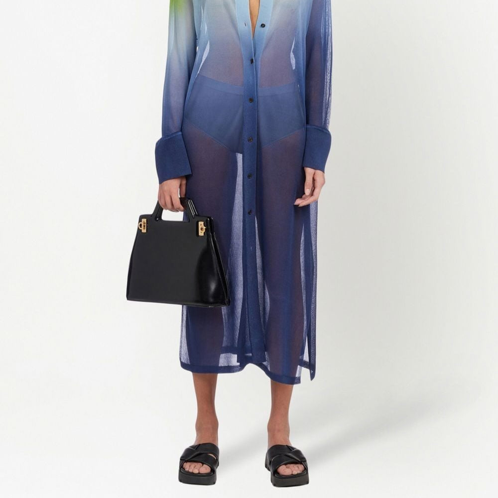 Intense black, veal leather, swivel closure gancini, handle with design cut out, unique compartment and gold -colored details. Wanda leather top-hndle bag Size and Fit - Width 14,17 in / 36 cm Height 9,06 in / 23 cm Depth 3,54 in / 9 cm Handle 2,56 in / 6,5 cm Strap 19,69 in / 50 cm