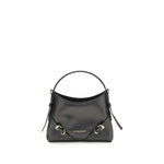 The Voyou Nano Bag by Givenchy, crafted from smooth and glossy calf leather, features a short handle, a removable thin shoulder strap, an embossed logo, and gold-toned metal details. With a main compartment lined in canvas, it combines style and practicality in a compact design.