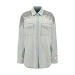 Cotton Boyfriend Shirt by Golden Goose, classic collar, pearl snap button front closure, two front patch pockets with flap for closure, adjustable button cuffs, bright beaded and beaded appliqués embossed on shoulders, oversize fit.