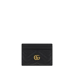 Calfskin Card Holder by Gucci, gold GG logo plaque on front, card slots on front and back, matelassé leather print.