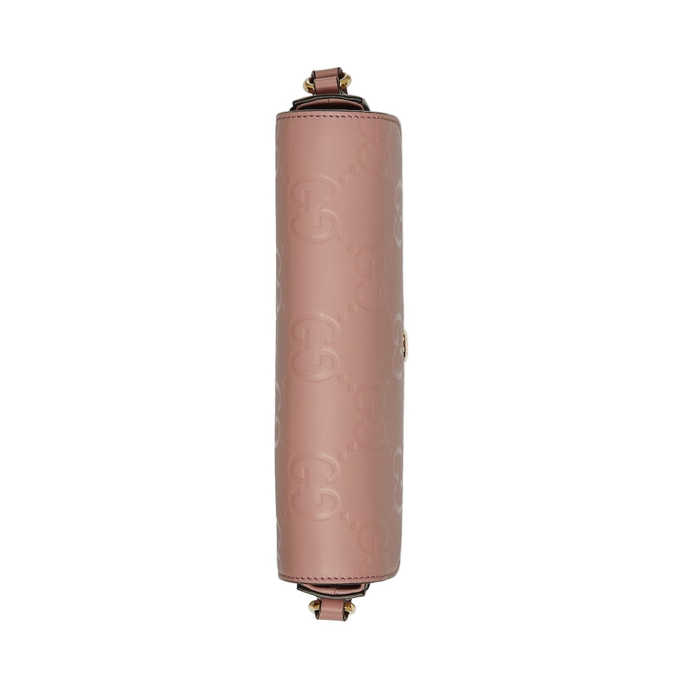 The initials of Founder Guccio Gucci continue to decorate leather accessories, connecting smaller contemporary pieces to Gucci’s heritage. Here the emblematic GG motif plays on texture and a shiny finish to define this shoulder bag in a delicate lilac.
