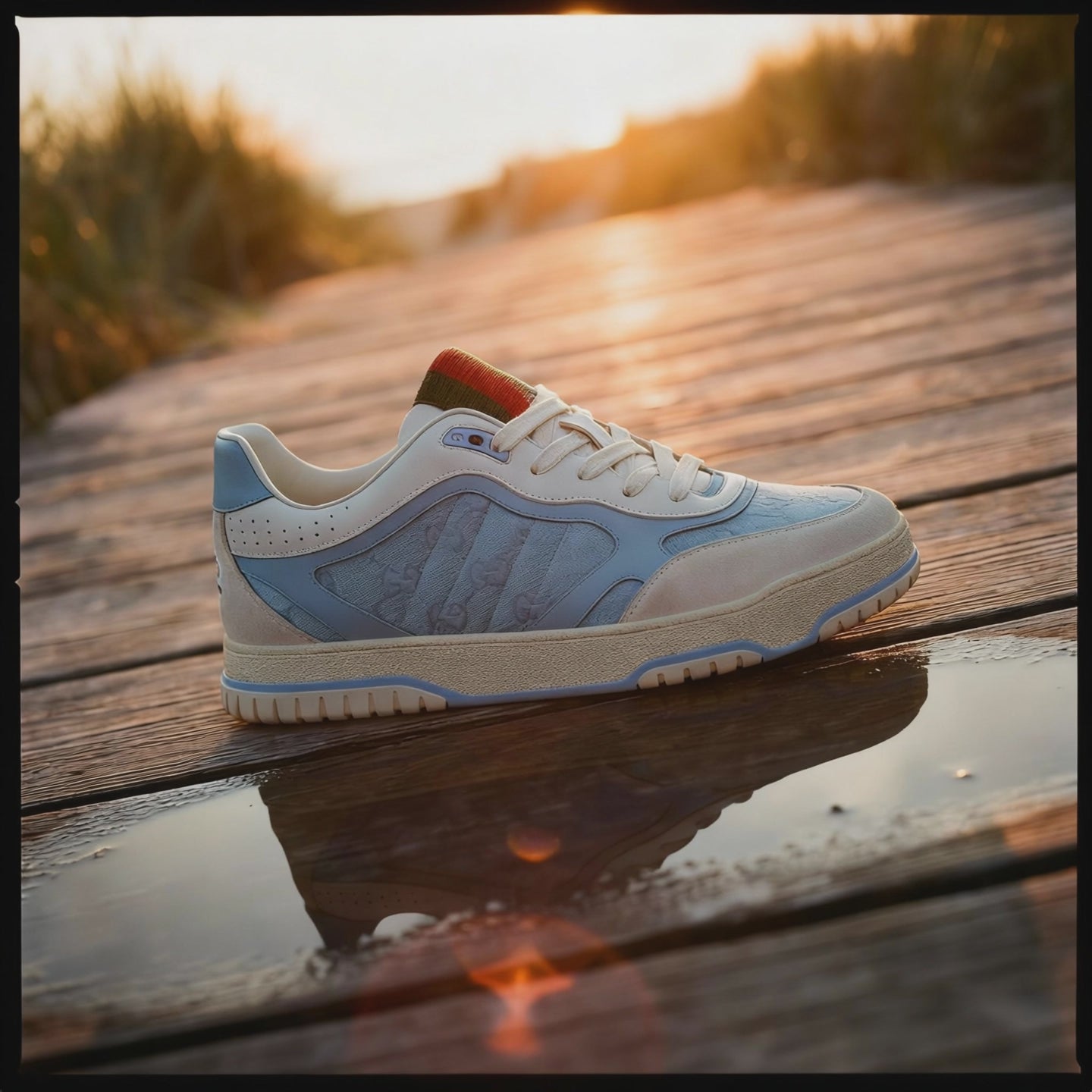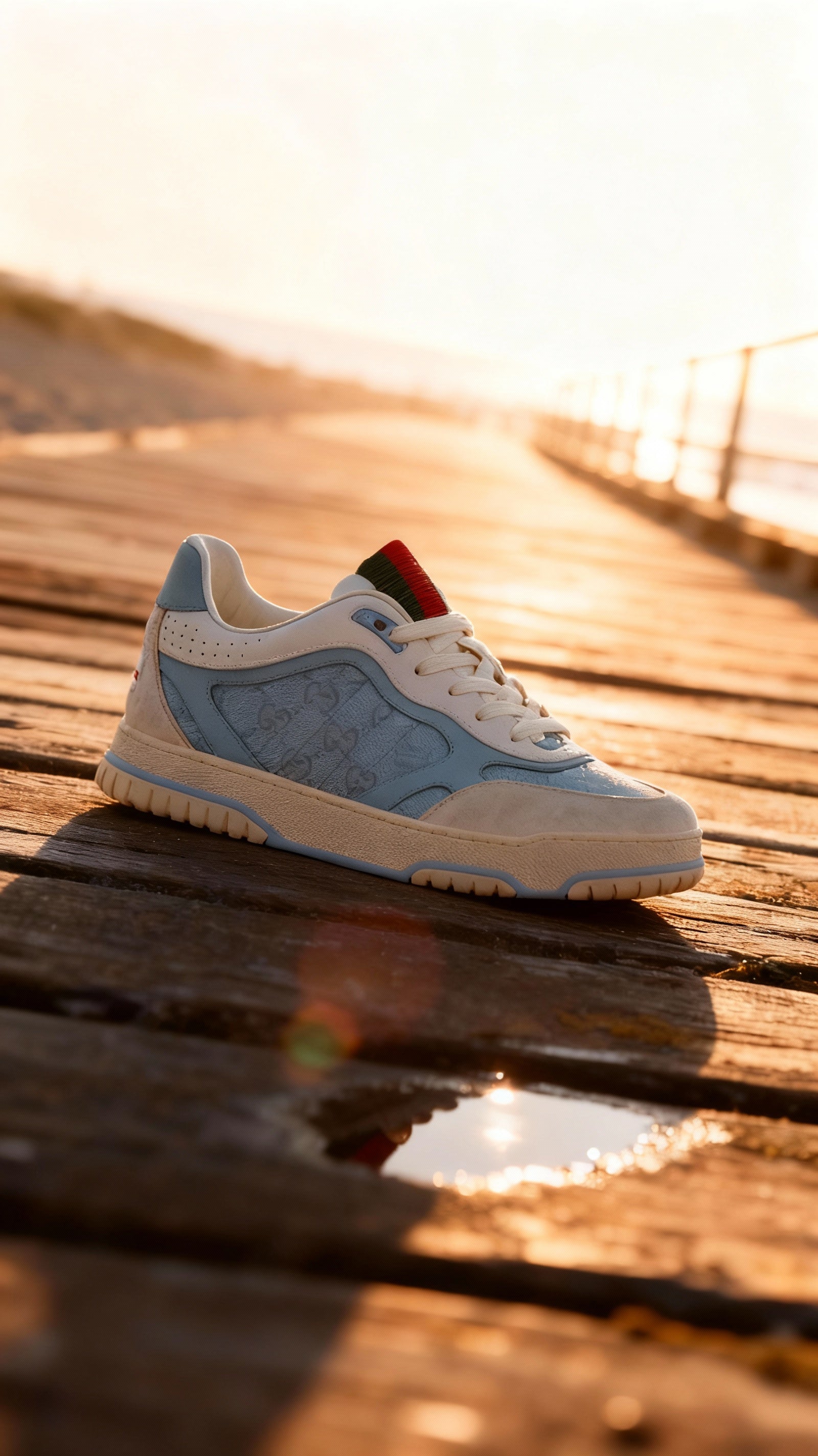 In the Spring Summer 2025 collection, the Re-Web sneaker returns in new colorways from a mix of GG canvas and leather. The modern pastel tones, fit for the coming season, appear alongside heritage details from the GG motif to the Web stripe.