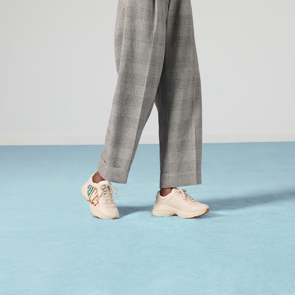 Designed with a thick sole and bulky construction, the leather sneaker is remindful of the old school hip-hop scene and embodies the ’90s influence pervading the Pre-Fall 2018 collection. Inspired by the tags decorating retro athletic uniforms, the glitter Gucci game motif enhances the side of the shoe.