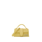 Jacquemus Yellow Hammered Leather Le Mini Bambino Bag. Shoulder bag with adjustable and removable shoulder strap, single handle, front opening with flap and covered magnetic button, single internal compartment and pocket, silver metal logo applique on the side. Patch pocket on the back.