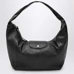 Large hobo bag by Longchamp in black leather, featuring a top zip closure with a zip pull adorned with small studs, a flap with embossed logo and press stud and a top handle. Size and Fit - Width 32 cm x Height 21 cm x Depth 13 cm Handle drop: 30 cm