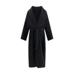 The Coat embodies the relaxed elegance of Tom Ford through a fluid and sophisticated construction. The double wool and cashmere fabric gently drapes the body, while the belt at the waist defines the silhouette with effortless balance. The shawl collar and soft shoulder line convey a refined yet laid-back attitude, enhanced by welt pockets and a back vent. A piece that celebrates essential luxury through perfect proportions and impeccable tailoring details.