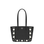 Valentino Garavani mini shopping bag in black grained leather featuring palladium-finish spherical studs, dual handles, front metal VLogo Signature, and internal zip pocket. Size and Fit - Width 20 cm x Height 17 cm x Depth 5,5 cm Handle drop: 18 cm